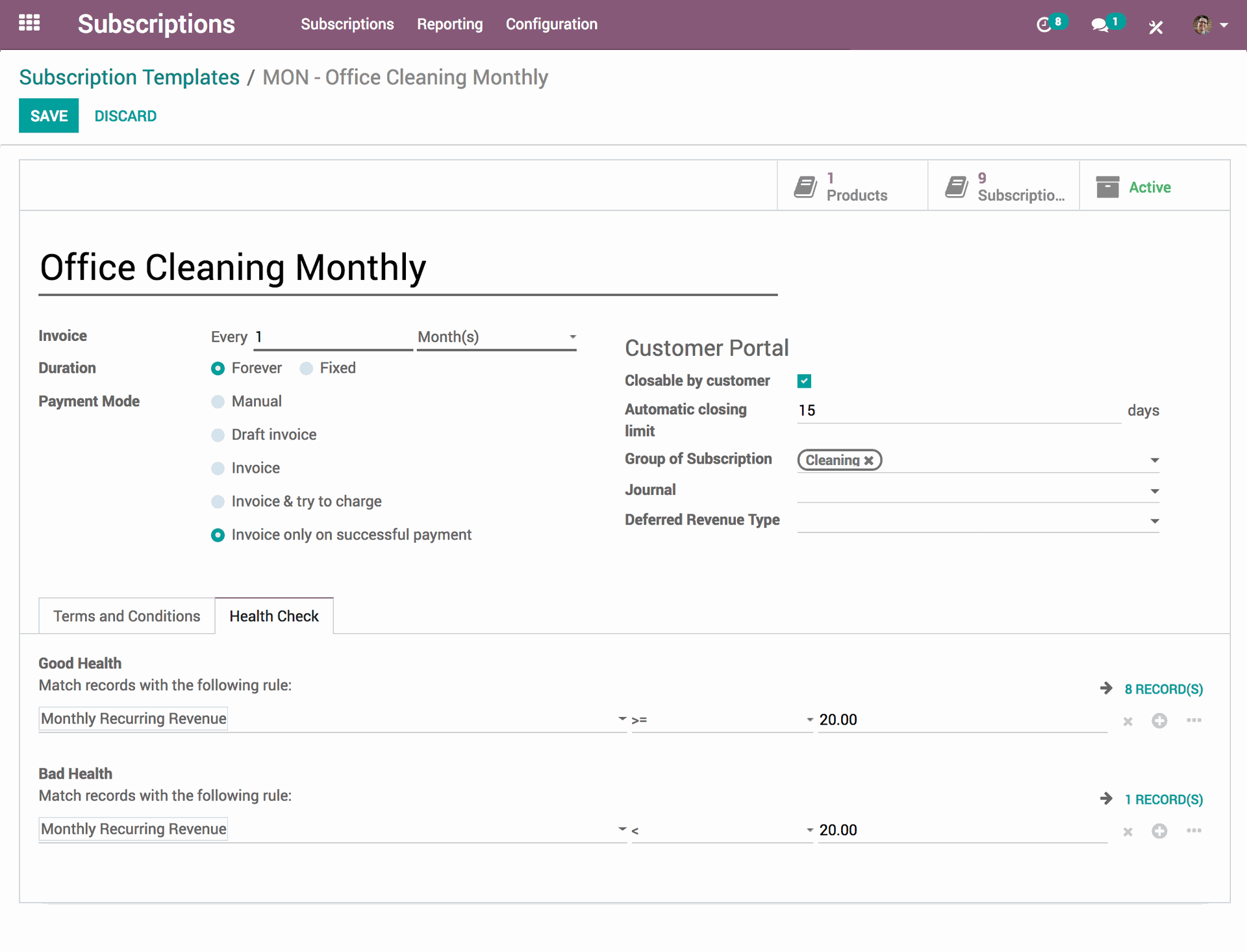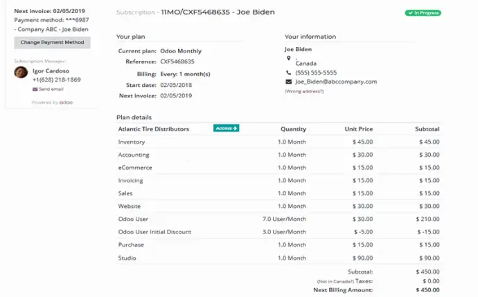 Terwijl Odoo automatisch terugkerende verkopen en abonnementen afhandelt, kan jij je focussen op de dienstverlening en relatie met je klanten. Je kan in een handomdraai eenduidige contracten opstellen, automatisch factureren, zonder stress je belastingen regelen en het overzicht houden over je betalingen. Alles verloopt automatisch volgens je voorkeursinstellingen.