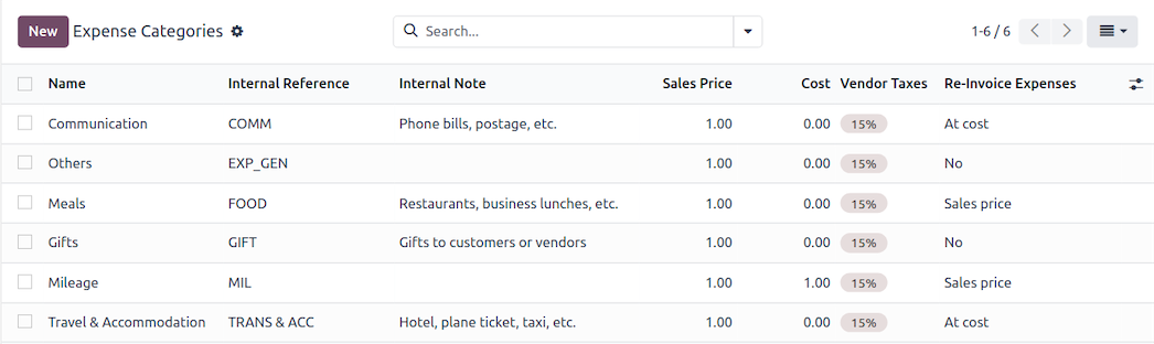 De onkostencategorieën zijn vooraf geconfigureerd! Wanneer je de Onkosten-applicatie installeerd, zijn er een aantal vooraf geconfigureerde onkostencategorieën beschikbaar zodat je meteen je onkostendeclaraties kan ingeven.
