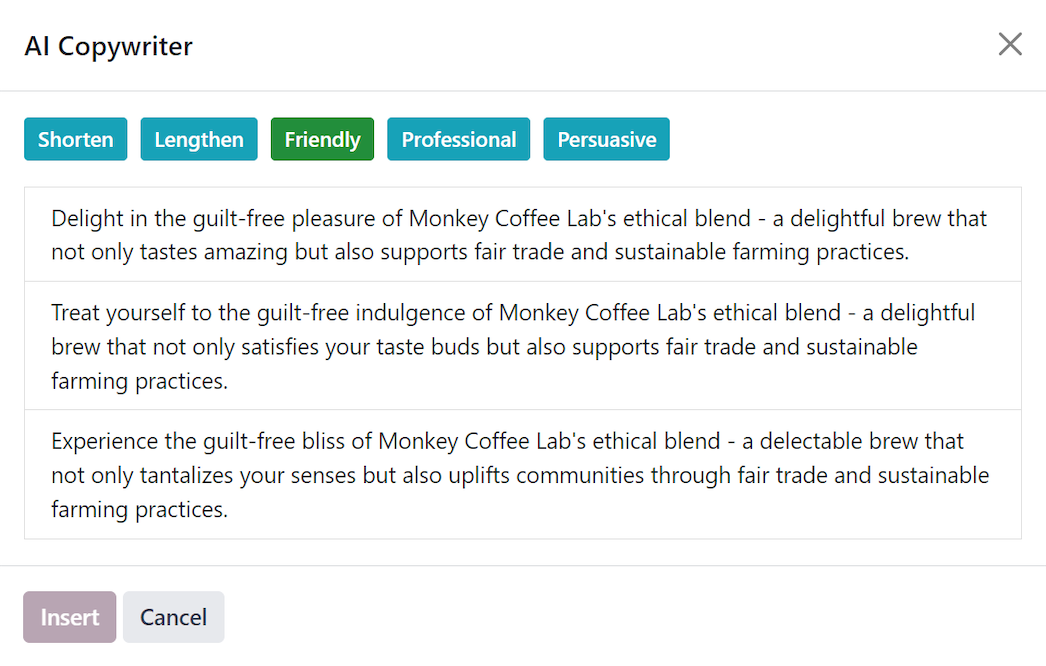 Geef je copywriting een boost met ChatGPT. Vraag Odoo om de inhoud van je website te genereren op basis van een eenvoudige prompt of verbeter je bestaande tekst door met één klik de juiste toon toe te passen.
